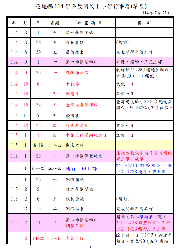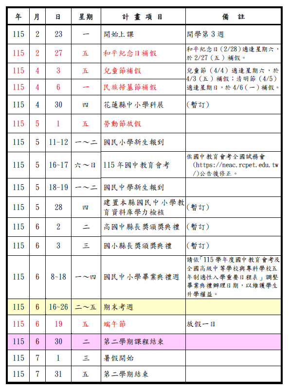 (重要)花蓮縣114學年度國民中小學行事曆